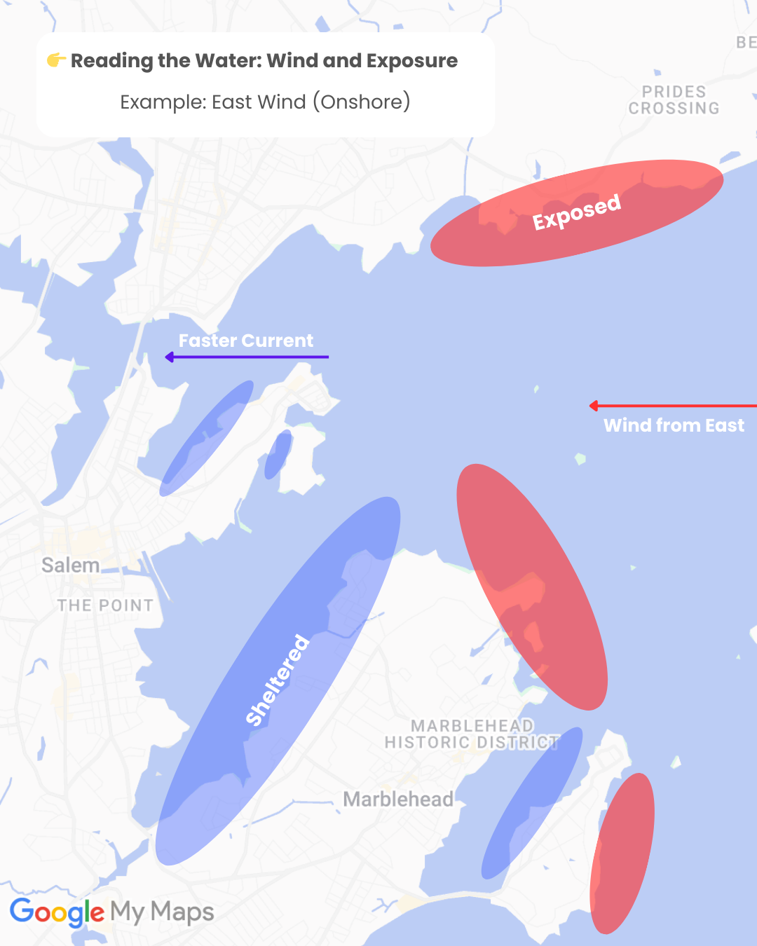 Small lakes and harbors might stay relatively calm even on windy days, but lakes, ocean, and stretches of some rivers can be pretty exposed. The key is understanding that the direction the wind is coming from is as important as how fast it’s moving.